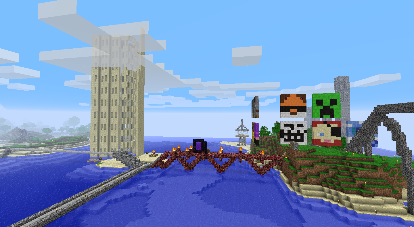 An image of the spawn island. There are pixel art faces, a bridge made of netherrack, and a large sand skyscraper